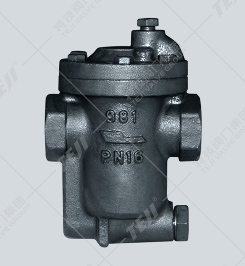 倒置桶式蒸汽疏水閥(981型)利用冷凝水和蒸汽的密度差的工作原理,內部結構是由杠桿系統連接倒吊桶,克服蒸汽壓力開關,倒吊桶式疏水閥內部是一個倒吊桶為液位敏感件,倒吊桶開口向下。裝置剛起動時,管道內出現空氣和低溫冷凝水,此時疏水閥是全開放,空氣和低溫冷凝水迅速排出,裝置很快提升溫度。當蒸汽進入倒吊桶內,倒吊桶產生向上浮力,倒吊桶連接杠桿帶動閥心關閉閥門。倒吊桶上開有一小孔,能自動排空氣,當一部份蒸汽從小孔排出,另一部份蒸汽產生凝結水,倒吊桶失去浮力向下沉,倒吊桶連接杠桿帶動閥心開啟閥門。當蒸汽再進入倒吊桶內,閥門再關閉,循環工作,間斷排水。